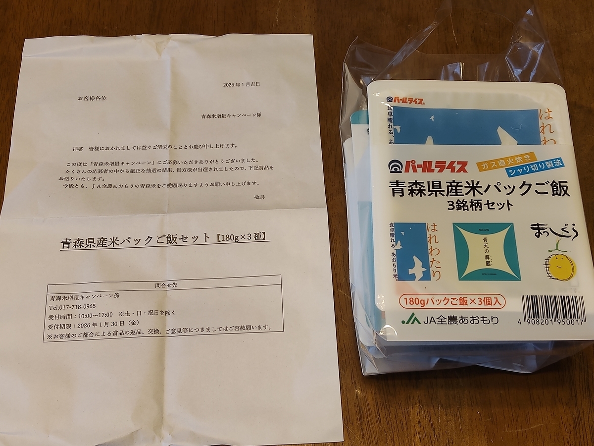 お米を買って当たる懸賞だったけど、その米は弘前市のお米とくらし応援券(市から配られた商品券のようなもの)で買った。